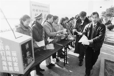 ■青岛市民排队为“挽留海鸥行动”捐款。 孙立摄于1995年