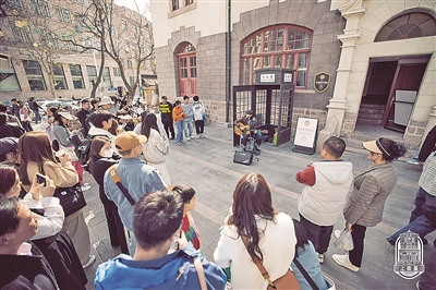 ■酒研舍乐队主唱在中山路城市记忆馆前表演。