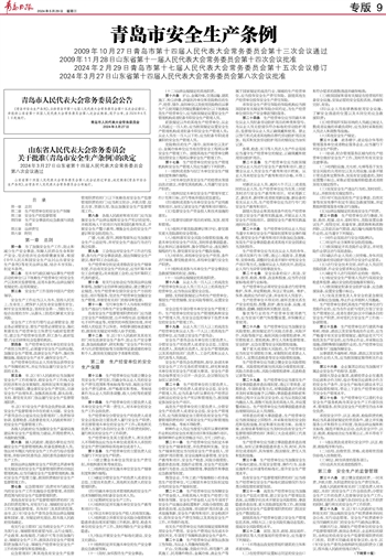 山东省第十四届人民代表大会常务委员会第八次会议经过审查,决定批准《青岛市安全生产条例》,由青岛市人民代表大会常务委员会公布施行。