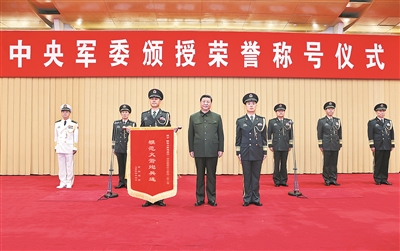 八一大楼仪式现场,部队官兵和文职人员代表整齐列队,气氛庄重热烈。下午3时30分许,18名礼兵正步入场,持枪伫立两侧,颁授仪式开始,全场高唱中华人民共和国国歌。中共中央政治局委员、中央军委副主席张又侠宣读习近平签署的中央军委授予荣誉称号命令,中共中央政治局委员、中央军委副主席何卫东主持仪式。
