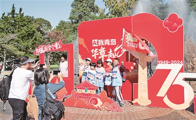 ▲10月1日,青岛中山公园节日氛围浓厚,不少游客前来拍照打卡。 刘 栋 摄