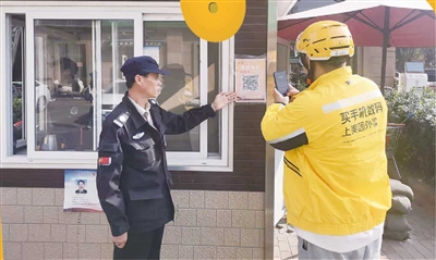 ■李沧区印象湾小区门口,外卖骑手通过扫描“骑鲁通”入场码进入小区。