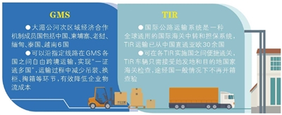 大湄公河次区域经济合作机制(简称GMS)于1992年由亚洲开发银行发起成立,成员国包括中国、柬埔寨、老挝、缅甸、泰国、越南6国。交通运输是GMS至关重要的合作领域。按照相关协定,企业持GMS道路运输许可证和TAD(暂入证)可以沿指定线路在GMS各国之间自由跨境运输,实现“一证通多国”,运输过程中减少了吊装、换柜、掏箱等环节,可以有效降低企业物流成本。