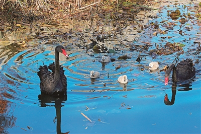 ▲在黑天鹅夫妇的呵护下,4只“萌宝”在湖面上觅食。