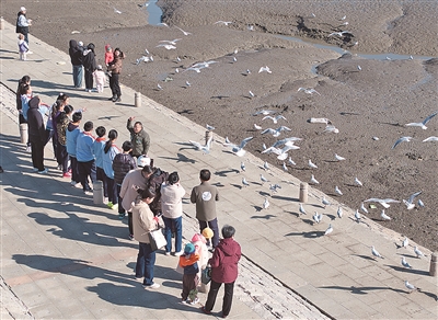 ■在墨水河畔,城阳区野生动植物保护协会的老师为市民介绍观察候鸟的相关知识。 刘 栋 摄