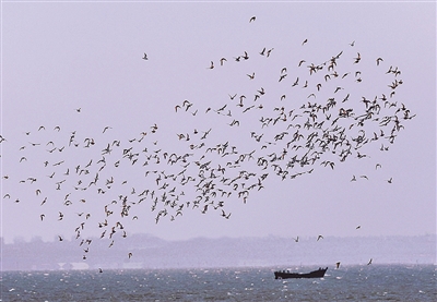 ■在胶州湾觅食的“鸟浪”。 赵健鹏 摄
