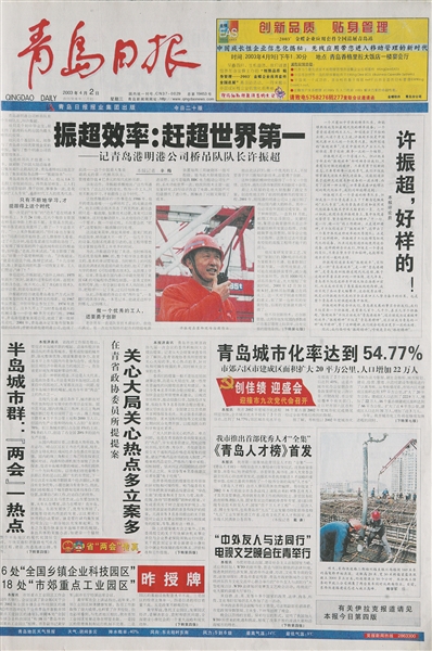 为什么要用个人名字命名这一效率?顺着这一线索,记者赶赴码头一线采访,深入挖掘“振超效率”背后的故事。4月3日,《青岛日报》一版刊发通讯《振超效率:赶超世界第一——记青岛港明港公司桥吊队队长许振超》,在国内新闻媒体中率先将“刻苦钻研、勇于创新、事事争一流”的产业工人典型许振超推出。2004年,该作品获中国新闻奖一等奖。