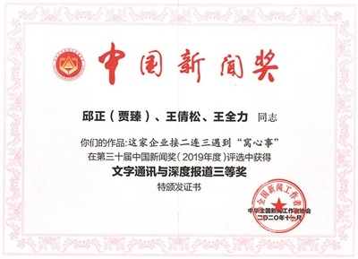 《这家企业接二连三遇到“窝心事”》荣获第30届中国新闻奖文字通讯与深度报道三等奖。
