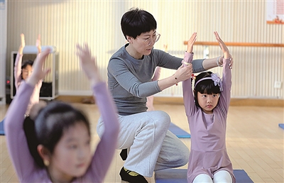 ■青岛宁德路小学的老师在舞蹈课上指导孩子。