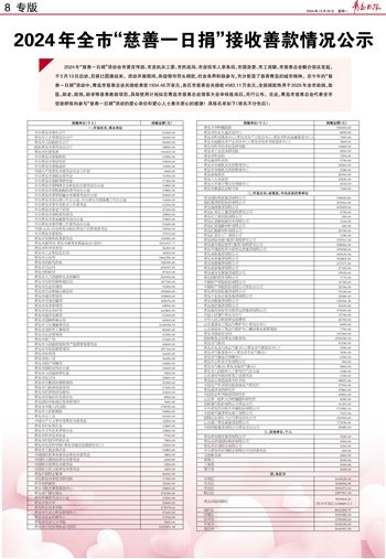 2024年“慈善一日捐”活动由市委宣传部、市直机关工委、市民政局、市退役军人事务局、市国资委、市工商联、市慈善总会联合倡议发起,于5月13日启动,目前已圆满结束。活动开展期间,各级领导带头捐款,社会各界积极参与,充分彰显了慈善青岛的城市精神。在今年的“慈善一日捐”活动中,青岛市慈善总会共接收善款1934.46万余元,各区市慈善会共接收4583.11万余元,全部捐款将用于2025年全市助困、助医、助老、助残、助学等慈善救助项目,具体使用计划拟在青岛市慈善总会理事大会审核批准后,另行公布。在此,青岛市慈善总会代表全市受助群体向参与“慈善一日捐”活动的爱心单位和爱心人士表示衷心的感谢!具体名单如下(排名不分先后):