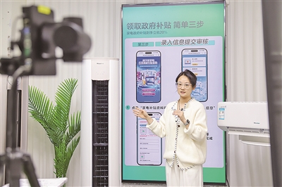 2024年11月11日,位于李沧区的深广互动直播基地内,主播在介绍家电以旧换新补贴政策。 张 鹰 摄