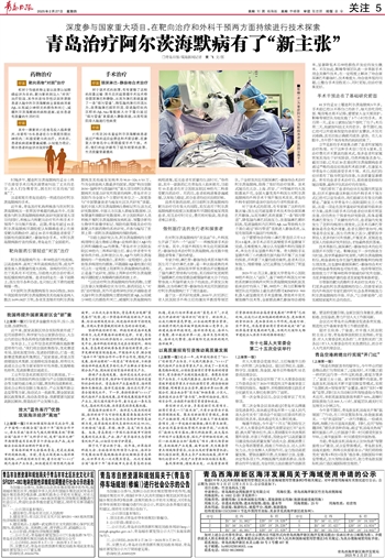 近年来,青岛医疗机构积极参与到对阿尔茨海默病这一世界医学难题的挑战当中,在深度参与阿尔茨海默病致病机制研究国家重大项目的同时,积极从内科靶向治疗和外科手术干预两个方向展开探索。近期,青岛有超过15名阿尔茨海默病早期轻度认知障碍患者正在接受靶向药物治疗,超过20名中晚期患者接受了创新性的颈深淋巴-静脉吻合手术。对阿尔茨海默病新疗法的探索,青岛走在了全国前列。