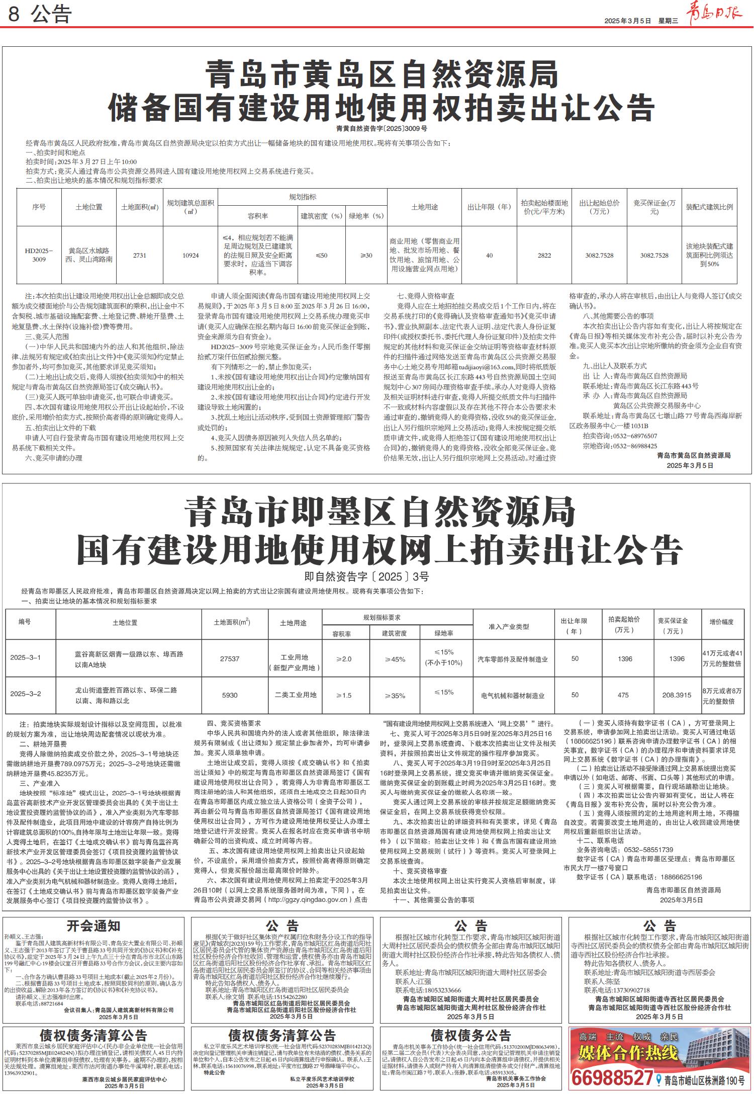 青岛市即墨区自然资源局国有建设用地使用权网上拍卖出让公告