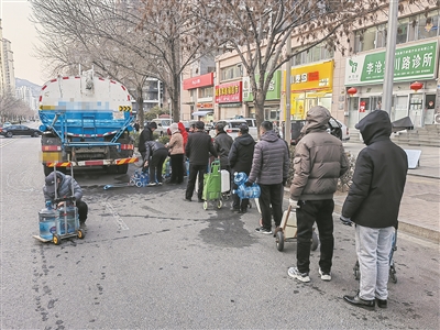 记者在一个周日清晨见到了这辆售水车,水罐上有“洒水车”字样。宾川路周边小区的居民手提水桶在路边排队买水。“这是来自二龙山的山泉水,卖了很多年了。”售水者说。7点半之后,这辆售水车又先后停在泉水支路、南王社区一条无名路上售水。