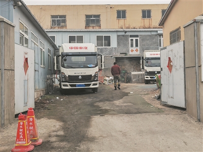 为“泉水配送机”供水的厢式货车在城阳区少山社区一平房处加水。