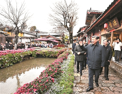丽江古城有800多年历史,被列入世界文化遗产名录。一场春雪过后,丽江游人如织。习近平来到这里,详细了解古城营建历史、纳西族民居特色和当地文化遗产保护利用、推动文旅融合发展等情况。居民和游客见到总书记十分兴奋,争相问好,有的还弹奏乐器、载歌载舞欢迎总书记。习近平频频与大家互动交流,了解商铺经营状况和游客感受。他要求当地处理好保护和发展的关系,让这座美丽的古城焕发新的光彩。