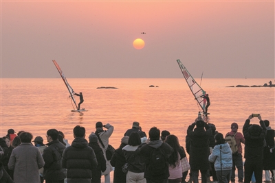 ■市民游客在第三海水浴场观看日出。于 滈 摄