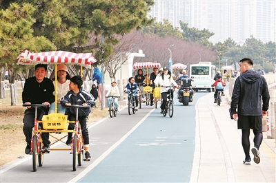 周末,位于西海岸新区的唐岛湾海滨公园成了骑行者的乐园,海滨绿道上,市民游客或跨上单车,或租辆多人骑脚踏车,尽享一段赏景与运动交织的美好时光。 梁 超 摄影报道