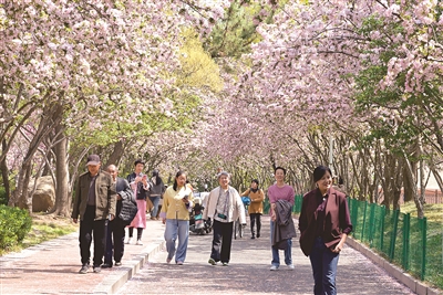 青岛李村公园的“网红”海棠路近日迎来最佳观赏期。道路两侧的西府海棠竞相绽放,满树嫣红,蔚为壮观。漫步其间,仿佛置身于鲜花隧道。