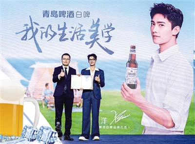 ■青岛啤酒股份有限公司副总裁李辉向杨洋颁发”金奖品质推广大使“证书。