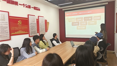 ▲中国海洋大学学生党员在东海苑“一站式”学生社区党团活动室作主题宣讲。