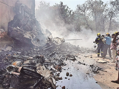 ■6月12日,消防员在印度古吉拉特邦艾哈迈达巴德附近坠机现场灭火。 新华社照片