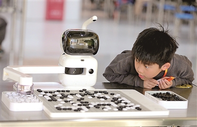 ▲青岛中央商务区学校的一位学生被围棋机器人所吸引。 韩 星 摄