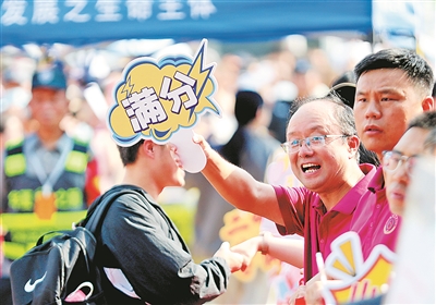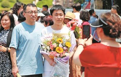 ▲考生结束考试在考场外与家人合影。