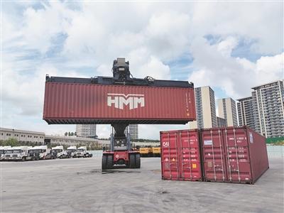 国赫通汽车技术园内,工人正在装卸集装箱。 王 凯 摄