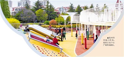 ▲胶州市市南小区内,居民正在中心广场休闲娱乐。