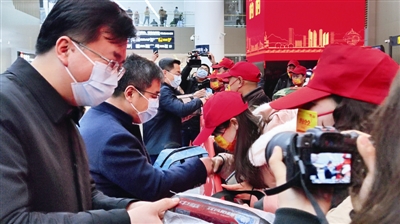 为深化青岛陇南两地协作,加快实现共同富裕,确保快速、高效帮助企业员工返岗复工,在山东、甘肃两省人社部门和山东省协作甘肃干部管理组的共同推动下,经青岛市人社局、青岛市乡村振兴局以及有关区市组织协调,本次“鲁甘人力”务工人员赴青岛“点对点”包机得以顺利成行。简短的欢迎仪式后,这批陇南籍务工人员分别前往青岛平度海信、黄岛机械、富元电子、平度万汇伞厂、国恩科技股份5家用人单位,实现了从“家门口”到“厂门口”的无缝衔接。图为陇南务工人员抵达胶东国际机场后,收到了青岛的“欢迎礼”。 任晓萌 摄影报道