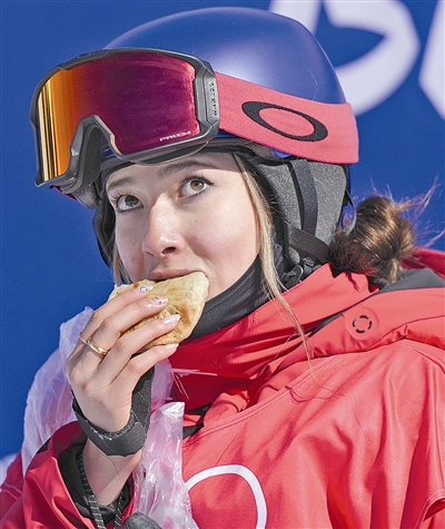 比赛打响,谷爱凌第一个出场。可能是热身不够充分的缘故,谷爱凌在第一和第三个道具区均出现小失误,第一滑仅得到57.28分。但对于自己实力的自信,让谷爱凌在第二轮继续轻装上阵,这一次,她顺利通过了所有道具区和跳台区,轻松拿下79.38分,排名第三稳稳进入决赛。令人忍俊不禁的是,在等候区等待分数时,谷爱凌掏出一个饼塞到嘴里大嚼起来,还满面笑容地对着摄像机镜头竖起大拇指。“我吃的是韭菜盒子!非常棒!百分之百推荐!”这位冬奥会的最大牌“吃播”赛后一脸轻松。