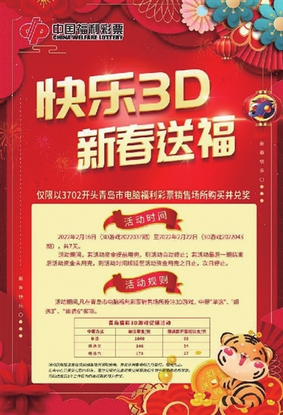老话说,过完正月十五元宵节,年就过完了。但今年因举世瞩目的冬奥会,这个虎年也变得极为特别,尤其是中国健儿奋勇拼搏的燃情时刻,让人心潮澎湃。恰逢其时,青岛福彩3D游戏携即开票投注金给大家送上好“礼”,为壬寅虎年增福添彩!活动时间为2022年2月16日(3D游戏2022037期)至2022年2月22日(3D游戏2022043期),共7天。