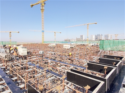 记者在项目建设现场看到,18日还只是零星分布的施工架体已经连绵成片,工人们正在架体上绑扎梁板钢筋。远远望去,施工人员身穿橙色工装马甲在红色的钢筋架体间穿行,如同一个个字符,组成项目建设运行的代码。28台塔吊开足马力,左右迅速移动运输建设物料,就像正在描画的大笔,让人心潮澎湃。