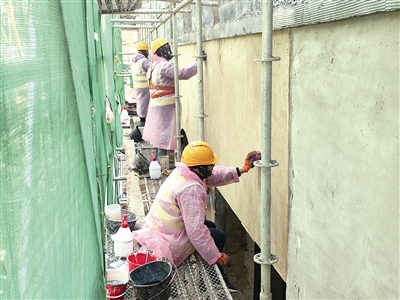 穿过布满脚手架的通道,进入里院内部可看到,近百名工人分布其中,如此密度让整个施工现场显得格外热火朝天。一阵刺耳的钢筋切割声传来,记者抬头看到几位建筑工人正在进行老旧墙体的加固施工,一根根钢筋穿墙而过,墙面附着一层钢丝网。“潍县路19号属于D级危房,墙体的酥碱程度严重,因此更新改造工艺繁多而复杂。” 高小明说。