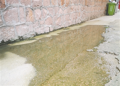 记者在现场看到,由于污水长时间浸泡,西侧的围墙上已出现了黑色印记,墙壁附近的道路也长出了青苔。“诚基公寓之前有物业管理,后来物业撤离由街道代管,工作人员也曾来投过几次下水道,但冒溢问题一直没有彻底解决,反复回潮已经四五年了。大夏天,污水横流不仅妨碍居民出行,还容易滋生蝇虫,严重影响居民生活。”何先生坦言。