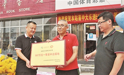 7月19日下午,胶州市3703003697投注站举行大奖出奖地庆祝活动。山东体育彩票管理中心青岛分中心主任贾芳华来到现场,代表体彩中心为该投注站颁发了“超级大乐透第22081期大奖中出福地”的奖牌。