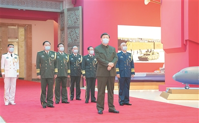 下午4时30分许,习近平来到中国人民革命军事博物馆,步入展厅参观展览。展览聚焦以习近平同志为核心的党中央领导国防和军队建设的伟大实践,安排8个单元展区,设置“党在新时代的强军目标”、“重整行装再出发”、“砺剑铸盾 奔向一流”、“大好河山 寸土不让”、“爱我人民爱我军”、“深情励三军 奋进新征程”等重点展项,通过1400余件文物实物、630余张照片、近百套武器装备模型以及大量图表、视频、艺术作品、互动项目等,生动展示了新时代国防和军队建设的壮阔历程和伟大成就,充分展现了人民军队忠诚维护核心、矢志奋斗强军的昂扬风貌。习近平不时驻足观看,认真听取讲解,询问有关情况。