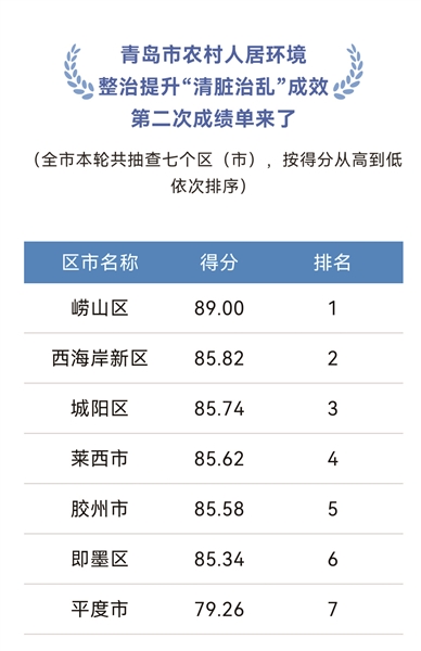 此次七个涉农区市农村人居环境“清脏治乱”成效从高到低排名为:崂山区、西海岸新区、城阳区、莱西市、胶州市、即墨区、平度市。此外,本轮还抽查了全市20个镇街100个村庄,并发布排名情况。