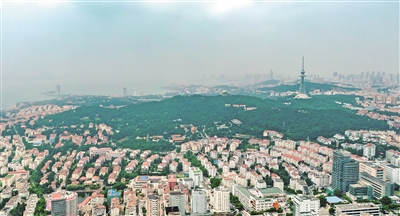 从空中俯瞰,这是一幅美轮美奂的画面——海浪拍打礁石,红瓦辉映绿树,被青翠色包围着的浮山和太平山遥相呼应,镶嵌在主城区的版图上,构成了一个辽阔、开放、优雅的城市生态客厅。而当我们把镜头拉近,则可以捕捉到“绿心”蝶变的诗意之美——棕红色的木质廊道蜿蜒,掩映在翠绿的植被间,荷叶铺满绿道旁的莲花池,节点处的景观园曲径通幽,仿古凉亭点缀其中。