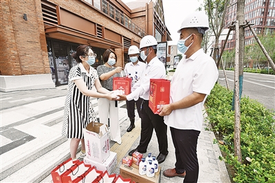 暑热天气中,市北区城市更新重点项目现场的工人们为了抢抓工期仍在奋战。近日,市北区历史城区管委会工会委员会与青岛福冈工贸有限公司的相关负责人来到位于登州路的重点项目施工现场,慰问一线工作人员,并送来了消暑纳凉和防疫的物品。