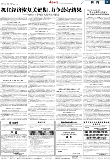 “下阶段,要坚持稳中求进工作总基调,进一步高效统筹疫情防控和经济社会发展,抓住经济恢复关键期,着力扩大国内需求,着力稳就业稳物价,有效保障和改善民生,巩固经济恢复基础。”付凌晖说。