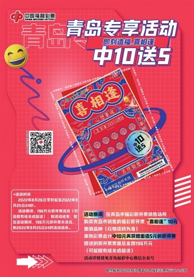 活动期间,在青岛市福彩即开票销售场所,购买青岛市销售的福彩即开票“喜相逢”10元面值品种(以物流码为准),单张彩票合计中10元再获赠面值5元的即开票。赠送的即开票票面总金额196万元(可能略有结余或超送)。
