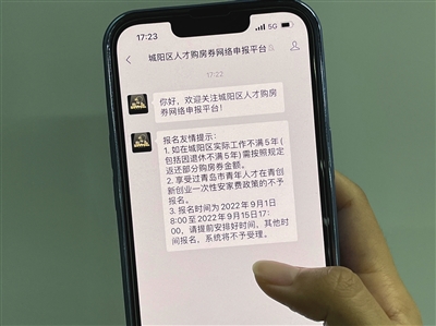 今年8月,为深入实施人才强区战略,满足人才多样化住房需求,城阳区出台《新引进人才发放购房券实施方案》,为2022年4月1日以后城阳区新引进就业且在城阳区无商品住房的各类人才发放不等金额的购房券,根据工作安排,于2022年9月1日至2022年9月15日进行网上申报,按照系统提示,提交相关材料进行报名。