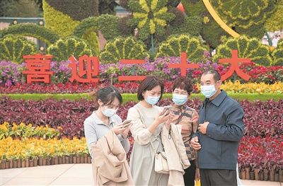 | ■青岛中山公园南门广场,“喜迎二十大 奋进新征程”主题巨型花坛吸引市民游客纷纷驻足观赏,拍照留念。刘 栋 摄 |