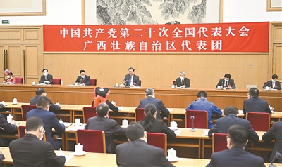 广西代表团刘宁、蓝天立、周家斌、祝雪兰、郑志明等5位代表结合实际对报告发表了意见,分别就奋力谱写中国式现代化广西篇章、铸牢中华民族共同体意识、保护好桂林山水、发展特色农业产业、不断深化自主创新等问题发言。大家认为,党的二十大报告站在民族复兴和百年变局的制高点,科学谋划未来5年乃至更长时期党和国家事业发展的目标任务和大政方针,提出一系列新思路、新战略、新举措,是指导我们全面建设社会主义现代化国家、向第二个百年奋斗目标进军的纲领性文献,一致表示拥护这个报告。