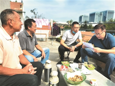 ■崂山区党员干部深入一线,为张村河两岸拆迁社区群众做好政策宣讲工作。