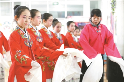 “赵美蓉进灯棚,丁字步站街中。杨柳腰把身挺,素白小扇遮着面容……”每天下午放学后,即墨区第四实验小学校园里总会回荡起委婉细腻的柳腔音律,这是孩子们正与专业老师学习经典曲目《赵美蓉观灯》。