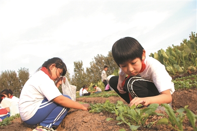 青岛蓝谷高新区东皋埠小学在校内开辟“阳光生态园”,利用劳动课、课后服务等时间,组织和指导学生进行耕种、除草、收割等田间管理。一个个“红领巾”在农田里挥洒着汗水,也收获了“果实”。