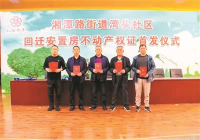 ■日前,湘潭路街道湾头社区举办回迁房不动产权证首发仪式,社区居民拿到了盼望已久的“大红本”,这也标志着社区旧村改造工程最终画上圆满的句号。